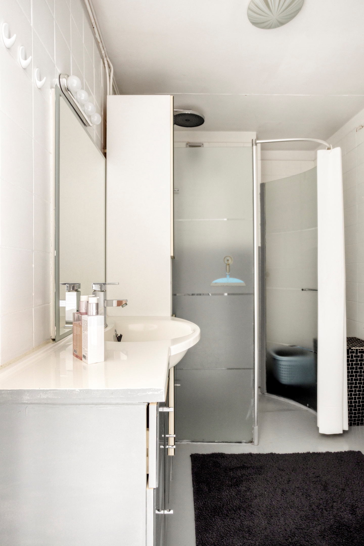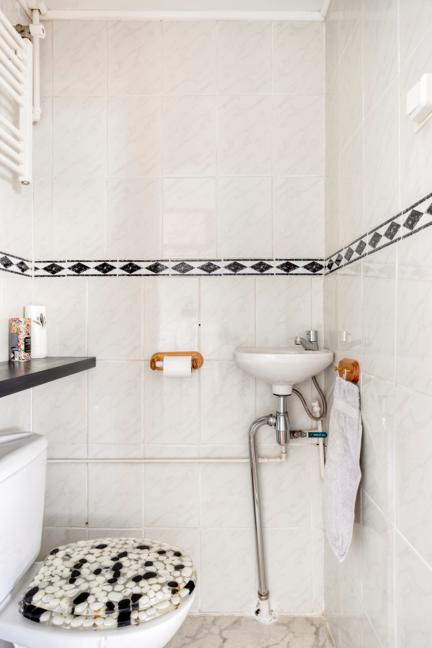 De badkamer is netjes en functioneel uitgevoerd en voorzien van een douche, wastafel en toilet.