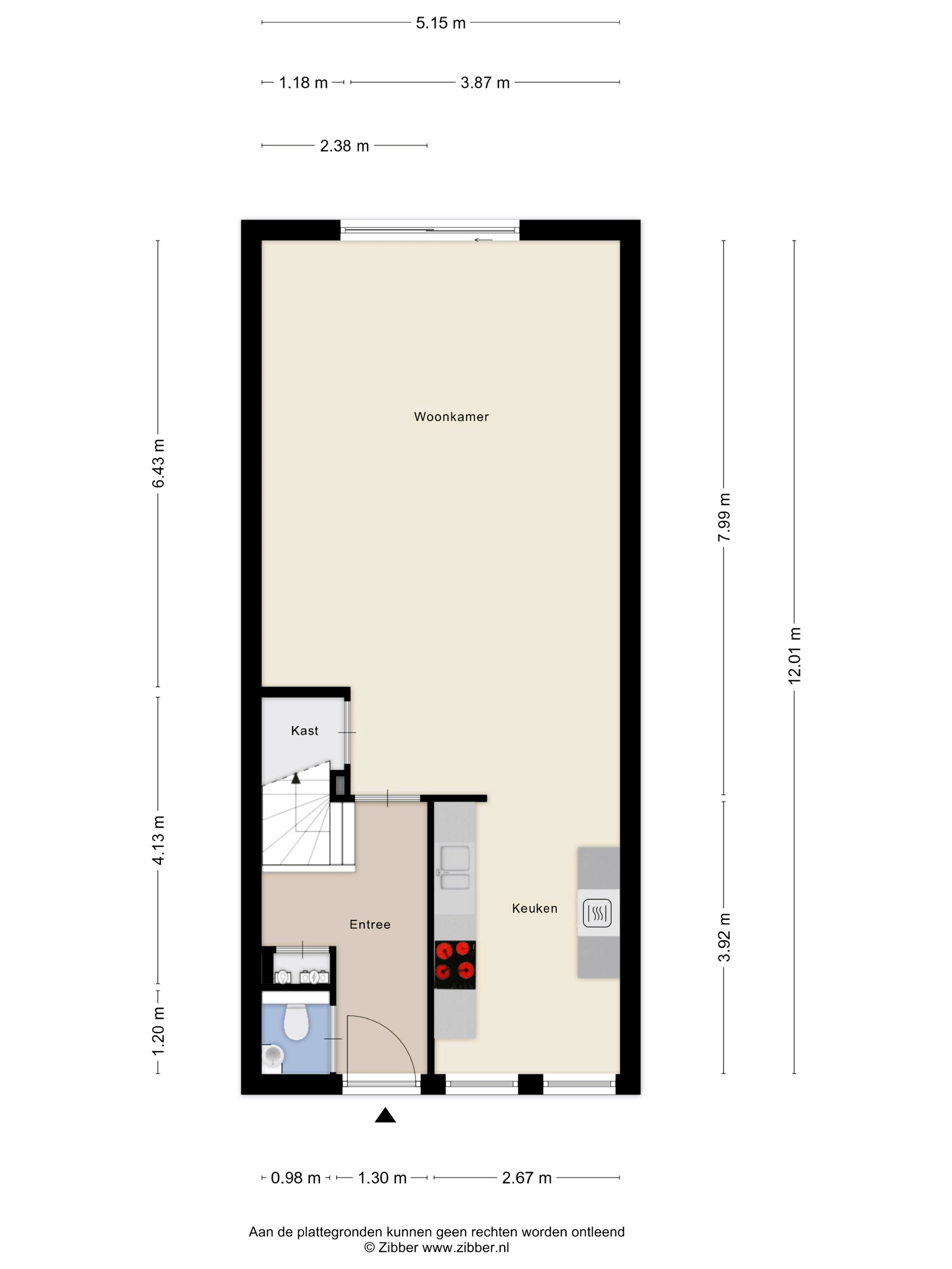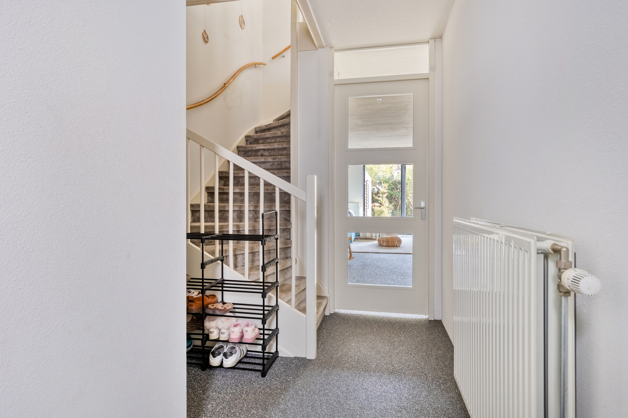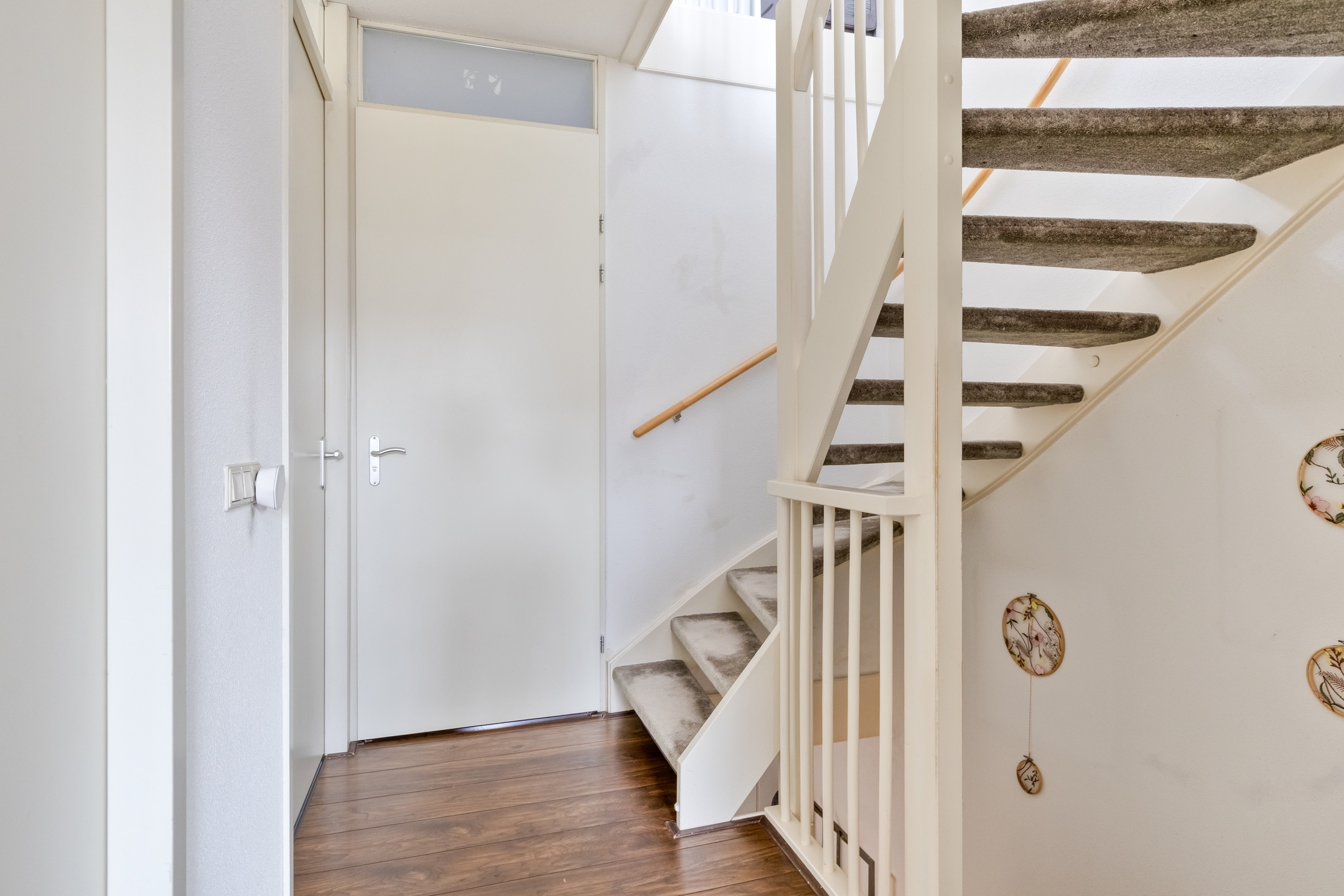 Entree in de hal met meterkast, trapopgang naar de eerste verdieping en een modern toilet met fonteintje.