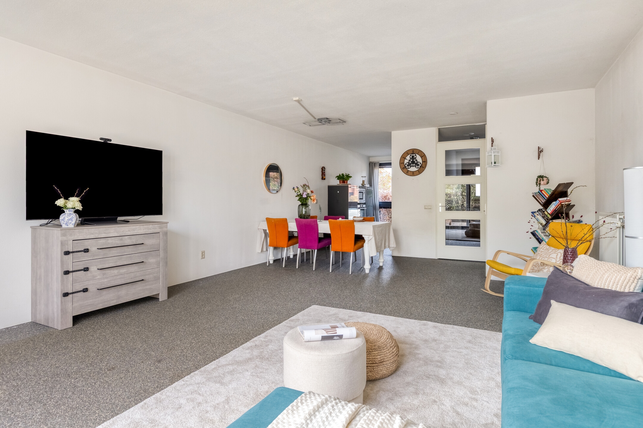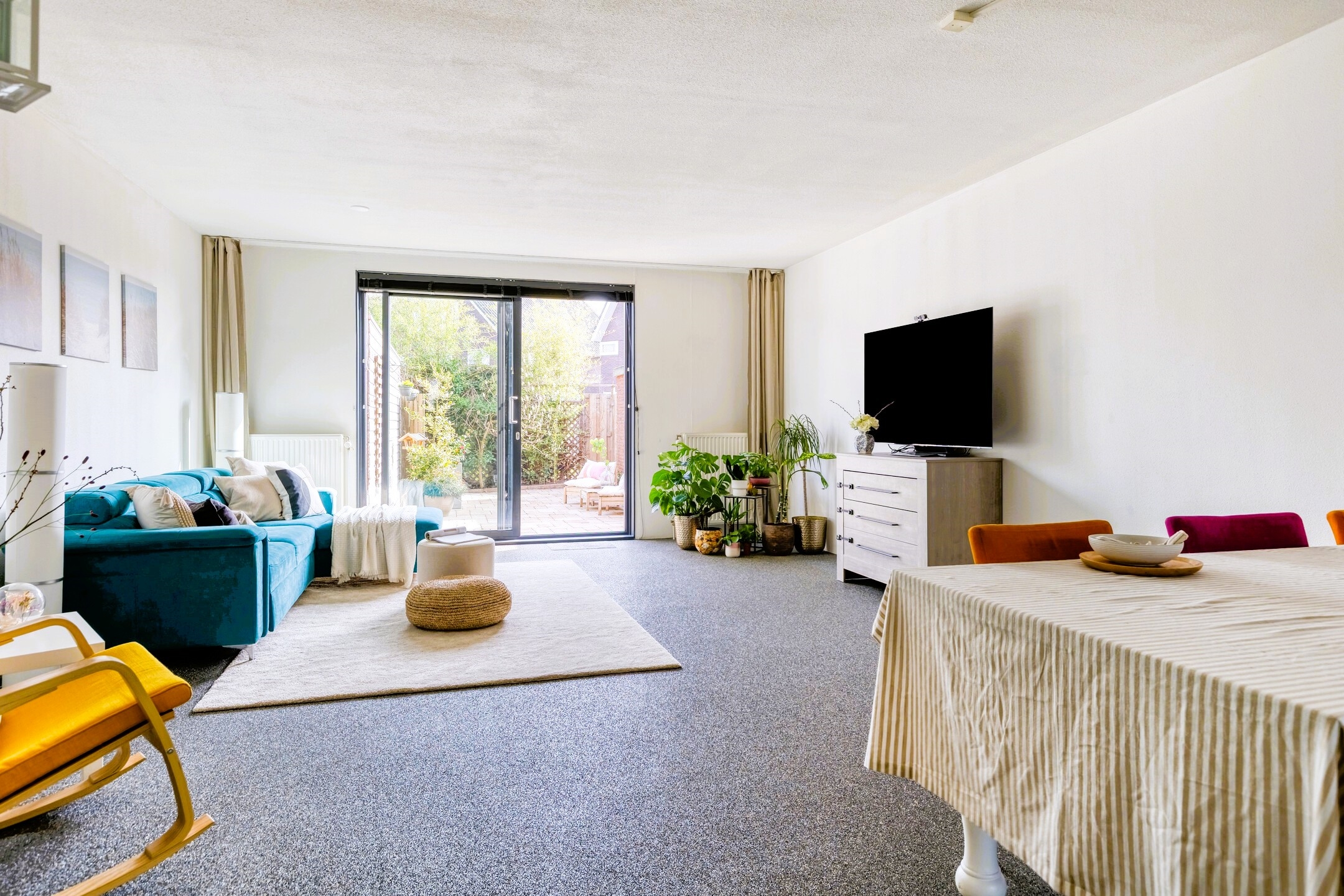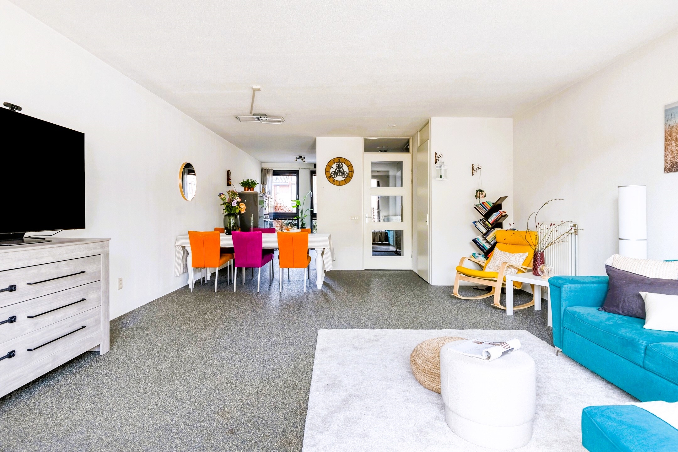 Vanuit de hal betreedt u de royale woonkamer. Deze tuingerichte living biedt veel leefruimte en heeft dankzij de grote raampartijen een prettige lichtinval. De woonkamer staat in open verbinding met de keuken aan de voorzijde van de woning.